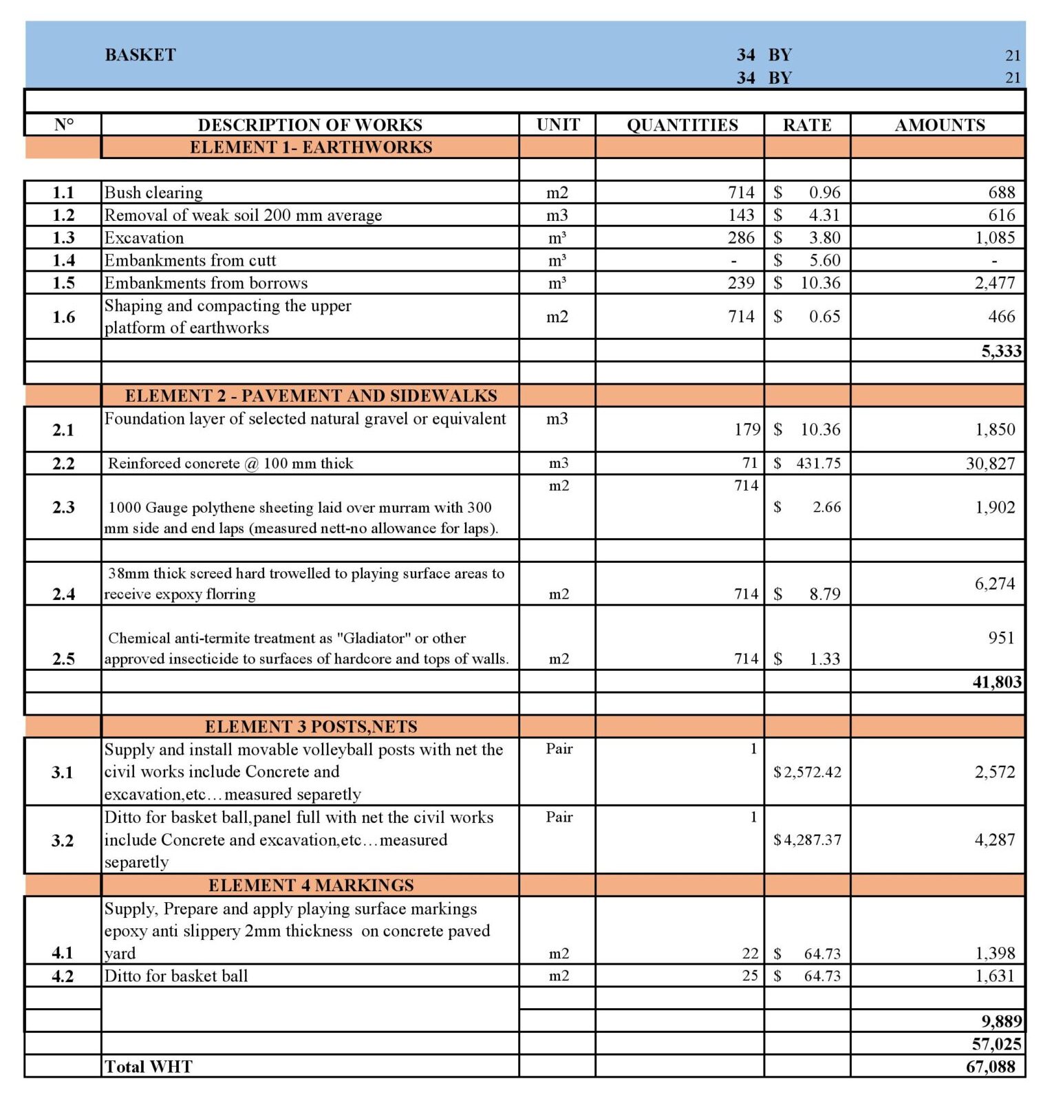 A professionally structured Bill of Quantities (BOQ) outlining all essential works, materials, measurements, and costs for constructing basketball and volleyball courts. Ideal for engineers, contractors, and planners, this document provides clear item breakdowns, unit rates, and total cost estimates for smooth project execution.